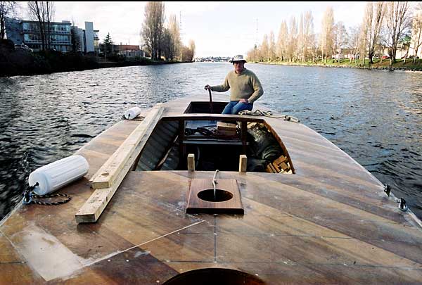 On deck, volunteer Paul Marlow at the helm heading toward Fremont