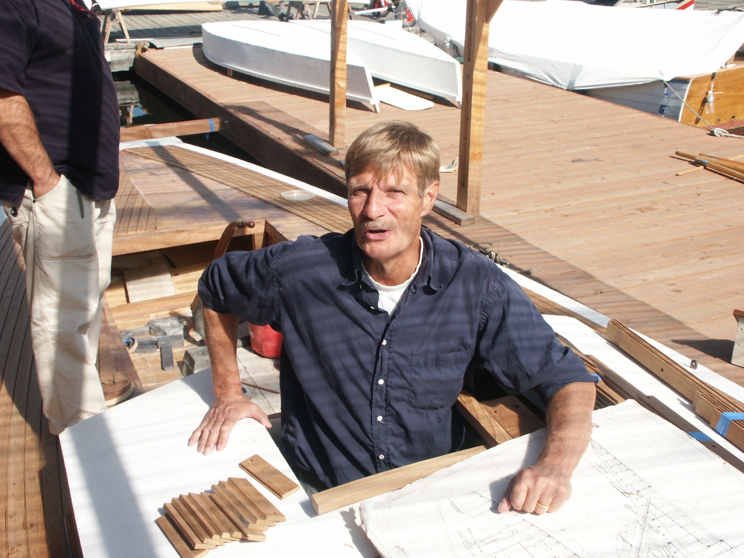 On September 26, 2003, world-famous yacht designer Peter Norlin stopped by to visit Pirate. He had been racing International 6-meters in Port Madison and been told of our restoration project. He designed the 6-meters Maybe X and Maybe XI, both of which Scott raced against in Sweden in 1975 and 1977. |