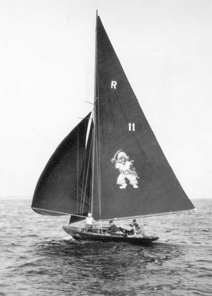 Matt Walsh's colorful suit of 1930 sails featuring the PIRATE cartoon on the mainsail. The main and spinnaker were black and the jib was dark green. Walsh can be seen on the starboard side of the cockpit in the fedora. Sawyer Collection, Newport Harbor Nautical Museum
