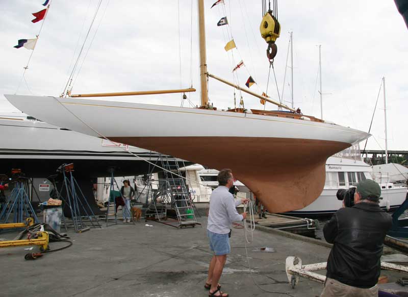 Pirate in her lifting sling at CSR Marine in preparation for her re-christening