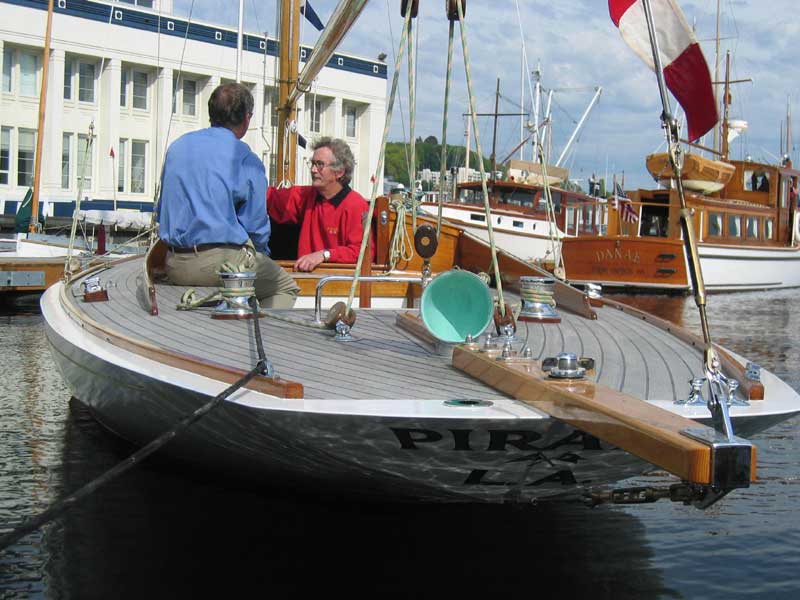 Detail of stern with boomkin. Scott chatting with Ted Geary's grandson, Grant Adamson